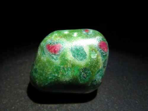 Cette sublime Pierre est une Fuchsite, variété de Mica Vert (la couleur verte étant due à la présence de Chrome) qui contient des inclusions de Rubis (Corindon Rouge) non Gemme.