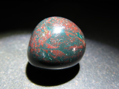 Le Jaspe Sanguin ou Héliotrope est un Jaspe Vert moucheté de Rouge. Comme son nom l'indique, il est un excellent régulateur et détoxifiant du système sanguin. Il est un bon anti-inflammatoire de l'arbre urinaire (vessie, reins), lors des cystites et coliques néphrétiques.