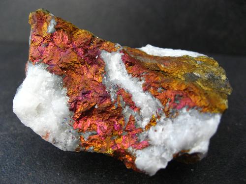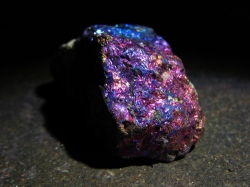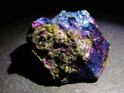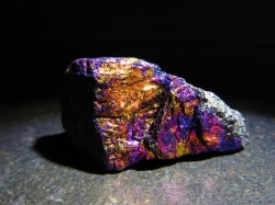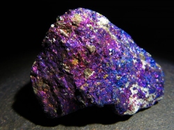 La Chalcopyrite est un sulfate de Cuivre et de Fer, ce qui lui donne ses Couleurs si Vives et Variées. Les plus fréquentes sont : le Violet, le Bleu électrique, le Gris Argenté et plus rarement le Orange et le Vert.